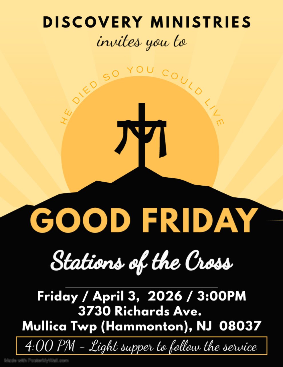 Friday, April 3, 2026 @ 3:00 pm - 5:00 pm Good Friday Stations of the Cross Discovery House 3730 Richards Ave, Mullica Township, NJ, United States